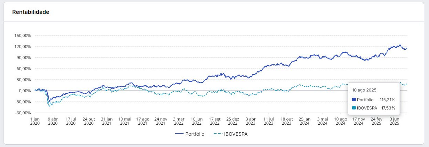 Em pouco mais de 5 anos, de jan/20 a ago/25, a carteira de Wevyw gerou um retorno de 115,21% no período, enquanto o Ibovespa gerou um retorno de apenas 17,53%.